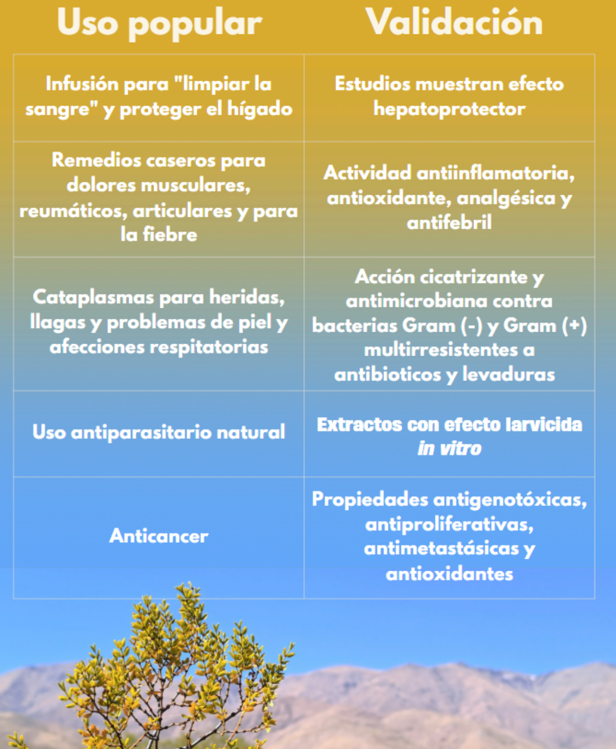 Isla, M. I., Moreno, M. A., de los Ángeles Álvarez, M., & Zampini, I. C. (2021). Some plants of the Monte region from Argentina: Phytochemistry and its use in health care. Studies in Natural Products Chemistry69, 349-369.